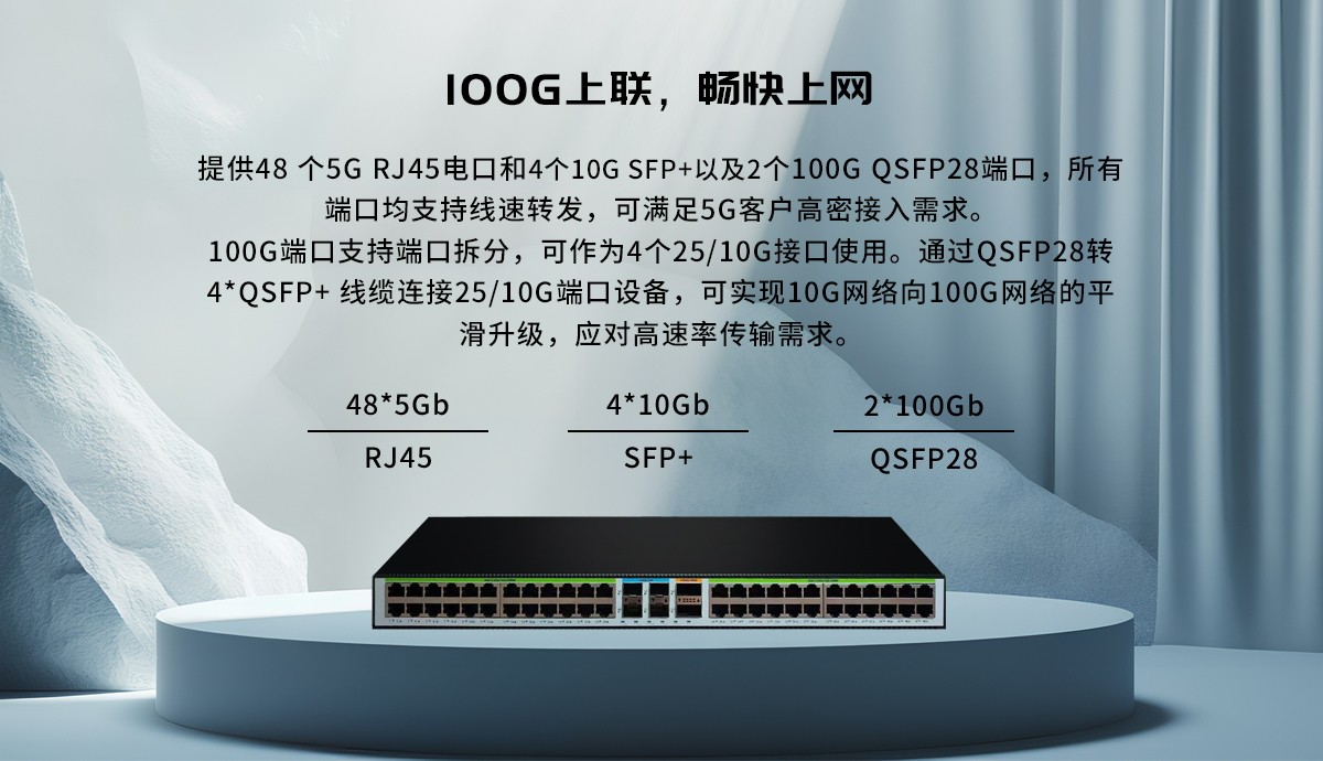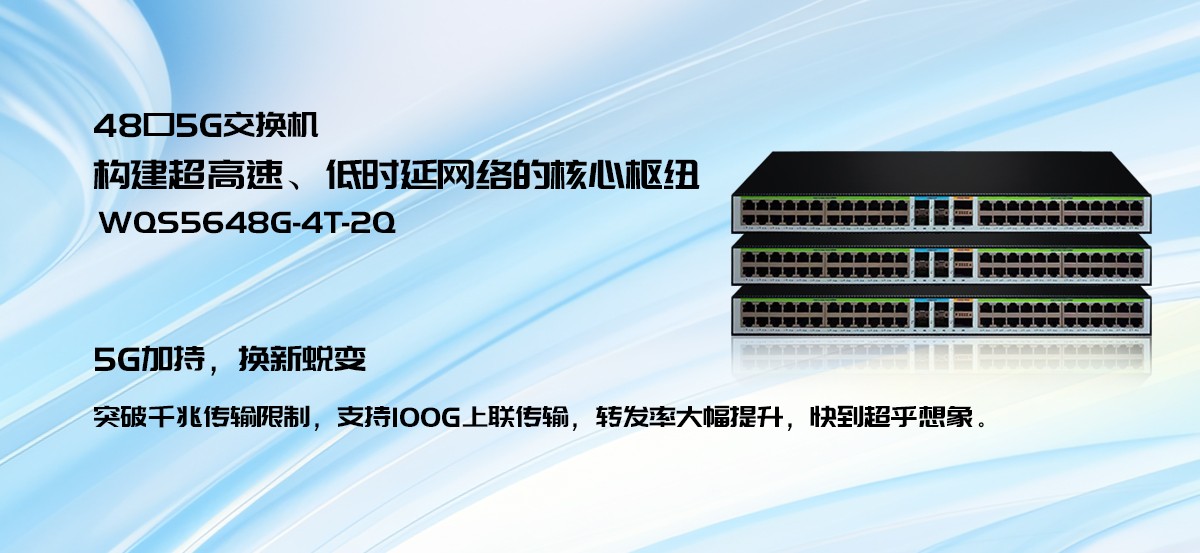WQS5648-4T-2Q 三层网管型交换机,48个5G电口,4个10G,2个40G/100G上行,既可满足下一代企业网、数据中心和城域网对于高密度高带宽的网络 应用需求,也可满足电信网络运营商或园区以太网汇聚层或接入层应用需求。